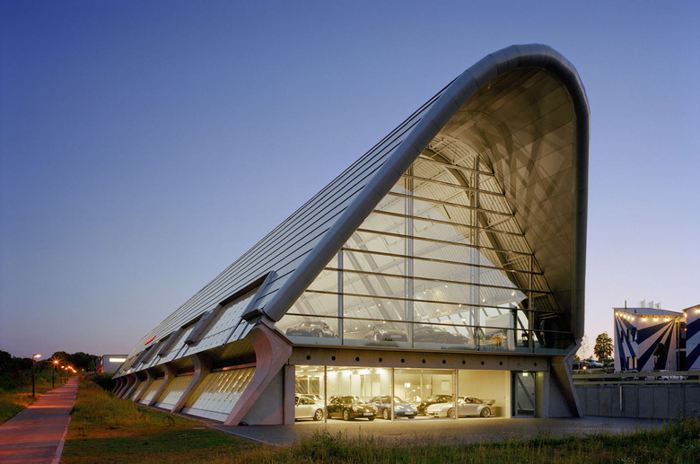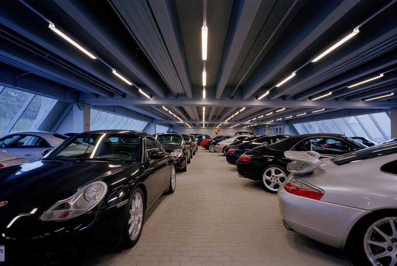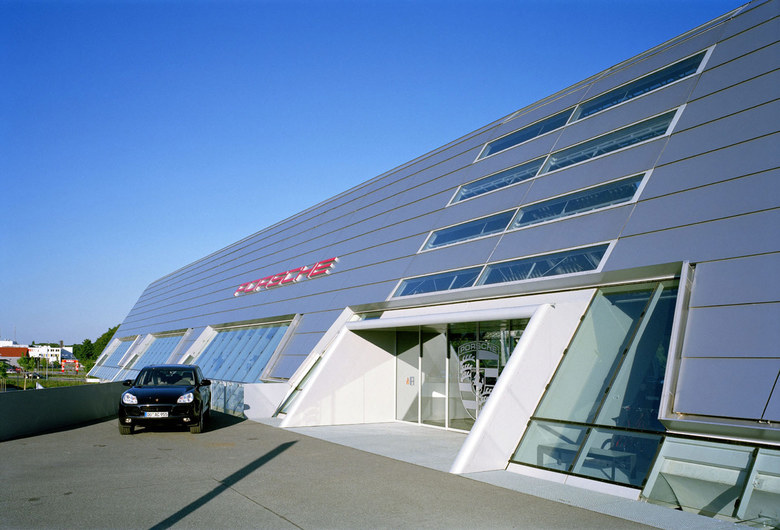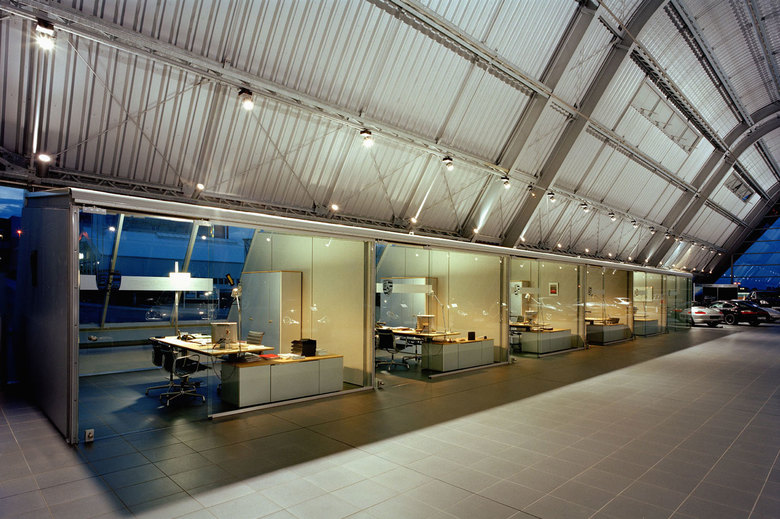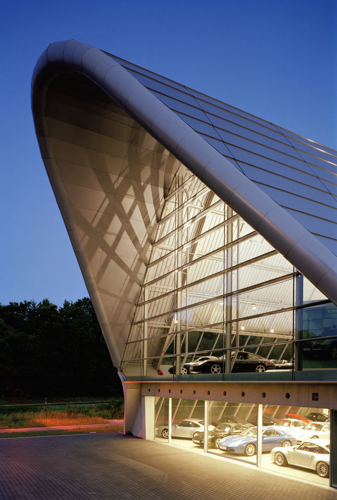 Porsche gilt als Synonym für technische Perfektion, formale Präzision, Leidenschaft, Tempo und Understatement. Porsche Dortmund verleiht der Sinnlichkeit dieser Attribute mit seinem neuen Gebäude signifikant Gestalt. Das Haus baut sich parallel zur Autobahn (B1) auf - als direktes Entree zum airport-business-park. Der Baukörper besteht aus zwei Bauteilen - einem Sockel zur Aufnahme der Topografie und einer darauf ruhenden Metallmembran, die einen 8 Meter hohen und 130 Meter langen Raum umhüllt. Die Silhouette erinnert an ein Aluminium-Strangpressprofil - als signifikanter Hinweis auf die hohen technischen Qualitäten der PORSCHE-Produkte. Alles ist einsehbar - technischer Service wird inszeniert. Eine Café-Lounge liefert online Bilder aktueller Rennsportereignisse, zeigt laufende Produktionsprozesse oder Testläufe der PORSCHE-Typologie. Nachts tritt das Gebäude medial in Erscheinung und kommuniziert über die transparenten Fassaden mit Lichtinstallationen PORSCHE-Images. Die Konstruktionen des Hauses sind insgesamt vorgefertigt - der Betonbau des Sockelgeschosses besteht aus in drei Richtungen gekrümmten, schräg stehenden Stützen, computeranimierte Laser- und Schweißmaschinen produzieren exakte Stahl- und Aluminiumbauteile, die als einzelne Module auf der Baustelle zum Objekt zusammengefügt werden.
