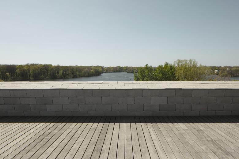 Das Erdgeschoss erhält großzügige Terrassen zur Spreeseite. Die Fenster der Bestandsfassade werden erneuert. Dabei wird spreeseitig die Brüstungsfläche der vorgehängten Betonelemente herausgetrennt und Schiebetüren in der Ebene dahinter installiert. Zwischen Betonelement und neuer Fassadenebene ist ein mobiler Sonnenschutz vorgesehen.