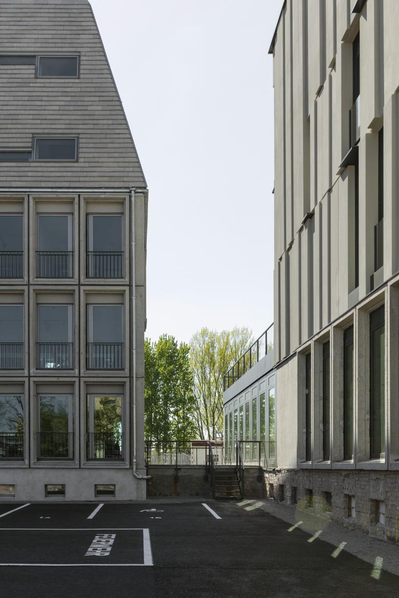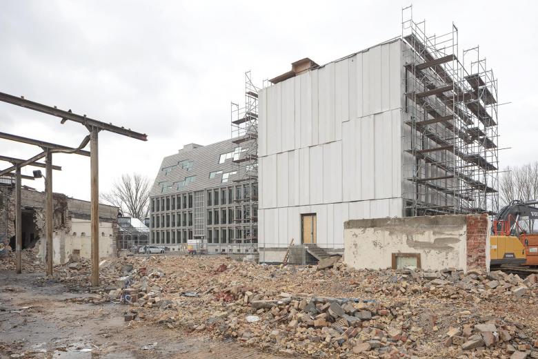 Fassaden der Längsseiten werden als schräggestellte Dachflächen errichtet, die der Giebelseiten als vertikale Fassaden. Die primäre Tragkonstruktion folgt dem vorhandenen Tragwerk in den Bestandsgeschossen und wir in Mischbauweise aus Stahl und Holz nach den Erfordernissen der Tragwerksplanung und unter Berücksichtigung der Anforderungen des Brandschutzes aufgestellt. Die skelettierte Konstruktion wird über Kerne und Wandscheiben ausgesteift.