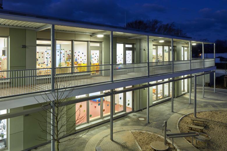 Energetische Optimierung der Gebäudehülle durch Vorgehängte hinterlüftete Fassade mit Mineralwolle und Faserzementplatten (VHF, 2 Farben im Wechsel angeordnet), Gasabsorptionswärmepumpe, Flächenheizung, Sonnenschutz mit Lichtlenkungsfunktion, Raumakustik, Markisen zur Verschattung vorgelagerter Spielzonen im Außenbereich, Gründach, Fotovoltaik.
