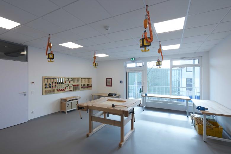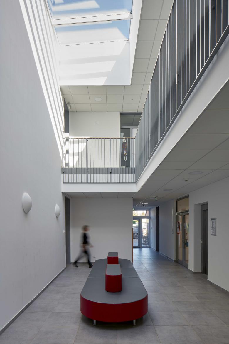 Das Gebäude bietet durchweg helle, lichtdurchflutete Räume mit Raumakustik, große Fensterflächen eröffnen rundum Ausblicke. Vorgelagerte Terrassenumgänge schaffen räumliche Tiefe und bieten natürliche Verschattung. Das Gebäude ist inklusiv und barrierefrei konzipiert.