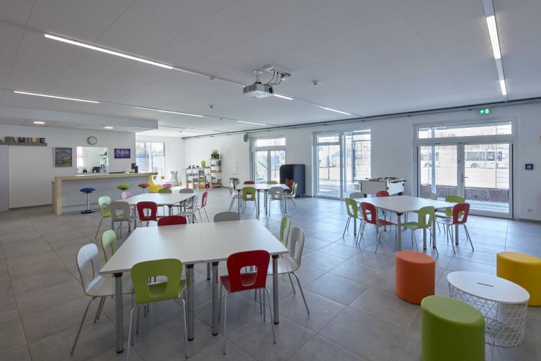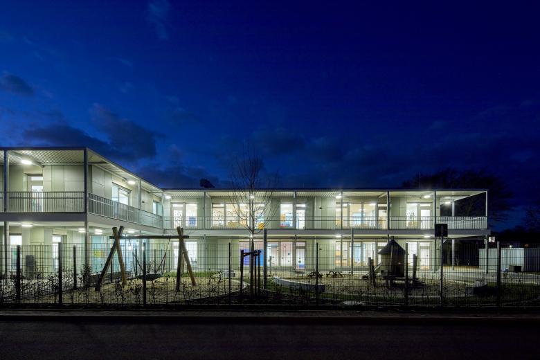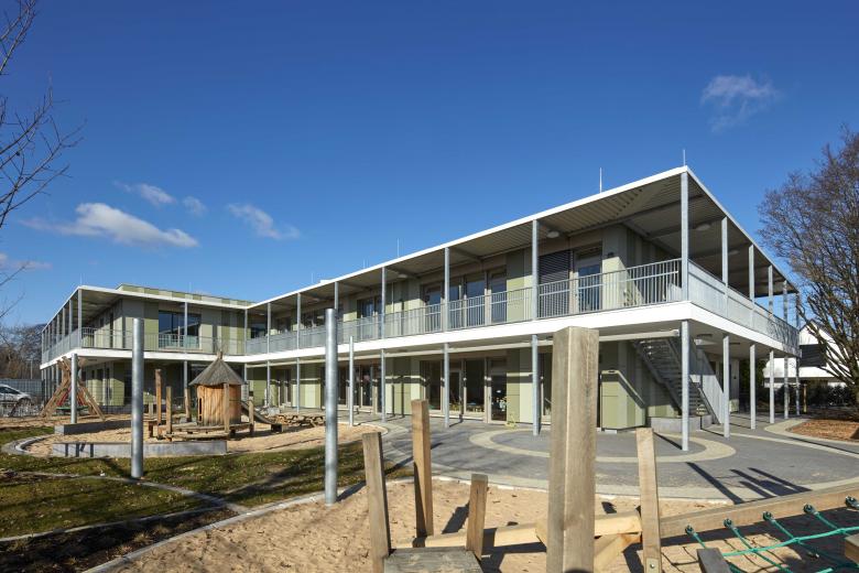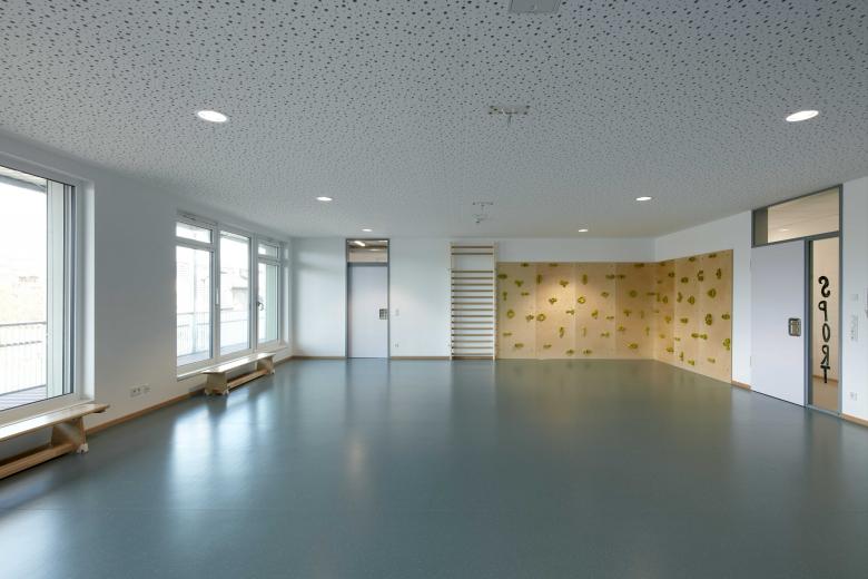 Unter einem Dach: Kinder, Jugendliche, Eltern und Familien finden hier Freiräume für ihre höchst unterschiedlichen Bedürfnisse. Das Gebäude bildet einen gemeinsamen, lichten Eingangsbereich aus und wird so zum Begegnungsort. Die Teilung der Nutzungen KiTa und Jugend/Familie erfolgt vertikal, die Einrichtungen sind räumlich getrennt auf 2 Geschosse verteilt.