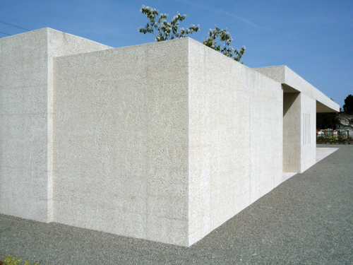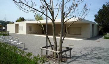 Ein niedriges, von Höfen und Aussenbereichen durchsetztes räumliches Gefüge aus gestocktem Kalkstein-Beton generiert die geforderten Räume. Mehr Skulptur als Haus integriert sich das Volumen in die Friedhofslandschaft und ergänzt das Layoutder reorganisierten Grabfelder mit einem gedeckten Abdankungsplatz.