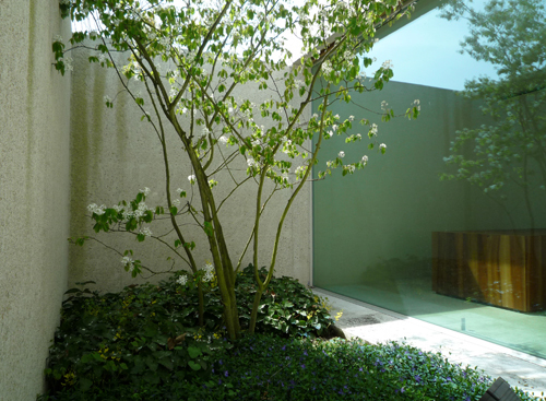 Die vier Aufbahrungsräume werden durch bepflanzte, begehbare Höfe natürlich belichtet, kleine mehrstämmige Bäume spenden im Sommer Schatten; Blüten, Laub und Astwerk zeugen vom Lauf der Zeit. Den Trauernden soll ein würdevolles Abschiednehmen wie in der "guten alten Stube" ermöglicht werden.