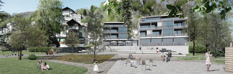 Das zu bebauende Grundstück liegt im östlichen Ausläufer der Kernzone von Weesen. Um die Körnung der bestehenden, dem historischen Ortskern vorgelagerten Häuserzeile zu respektieren werden zwei Gebäudevolumen vorgeschlagen. Dieses Ensemble markiert neu die östliche Zugangsituation zum historischen Städtli. Durch die Gebäudestellung entsteht strassenseitig ein kleiner Platz, welcher den öffentlichen Charakter der Erdgeschossnutzung akzentuiert und Distanz zum steinernen „Schlössli“ auf der anderen Strassenseite schafft. Zudem orientieren sich die Bauten auf der leicht erhöhten Parzellenlage klar zum See und zum grandiosen Alpenpanorama.