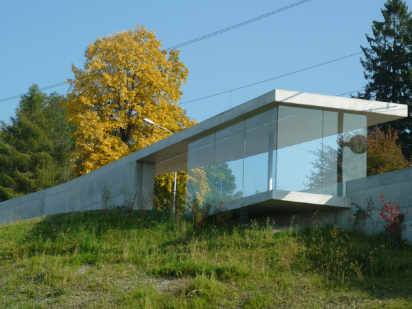 Die neu erstellte Haltestelle der Appenzeller Bahnen erschliesst das Neubaugebiet Birnbäumen und markiert an der Speicherstrasse den Eingang zur Stadt St. Gallen. Die horizontalen Mauerkronen thematisieren die markante Steigung der Strasse und inszenieren die Ausblicke auf die Stadt und den Bodensee.