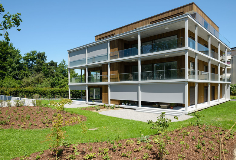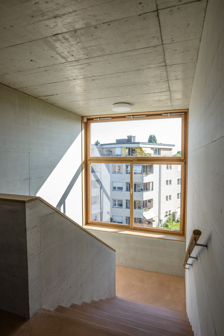 Die dreiseitig umlaufenden Balkone aus vorgefertigen Betonelementen legen sich wie ein Gitterwerk um die Gebäude. Sie bilden eine willkommene Übergangszone zwischen den Wohnräumen und der Umgebung. Diese Filterwirkung wird verstärkt durch die Hochparterre-Situierung der EG-Wohnungen und der damit verbundenen Ablösung der Bodenplatten vom Terrain.