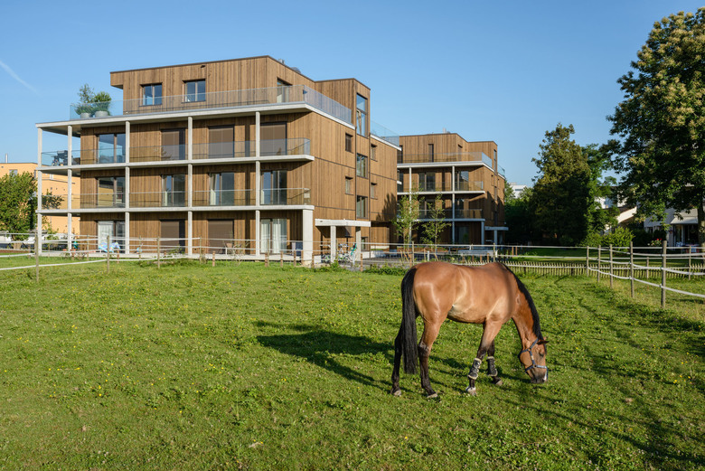 Die beiden Wohnhäuser sind beide in Holzbauweise erstellt mit einem massiven Erschliessungskern aus Sichtbeton. Die hinterlüfteten Holzfassaden aus druckimprägnierter Fichte widerspiegeln die Holzkonstruktionen der Häuser und wecken Erinnerungen an den einstigen wildhaft überwachsenen Garten. Mit dem nussbaumbraunen Farbton erscheinen die frugalen Fichtenbretter nun als nobles Fassadenkleid undund unterstützen das elegante Erscheinungsbild der Gebäude.