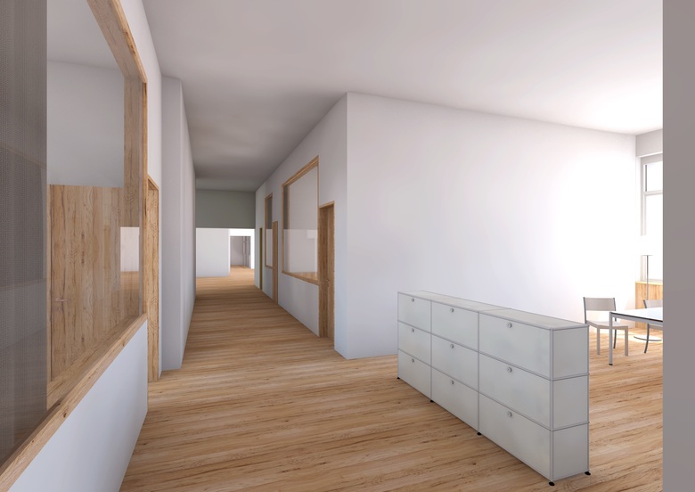 Die ursprüngliche Gebäudestruktur bleibt an den Unterzügen ablesbar. Der rückseitige Büroanbau im ersten Obergeschoss wird zugunsten einer begrünten Terrasse rückgebaut. Über einen "Kräutergarten" sieht man im neuen Empfangsbereich auf die bestehenden Produktionshallen.