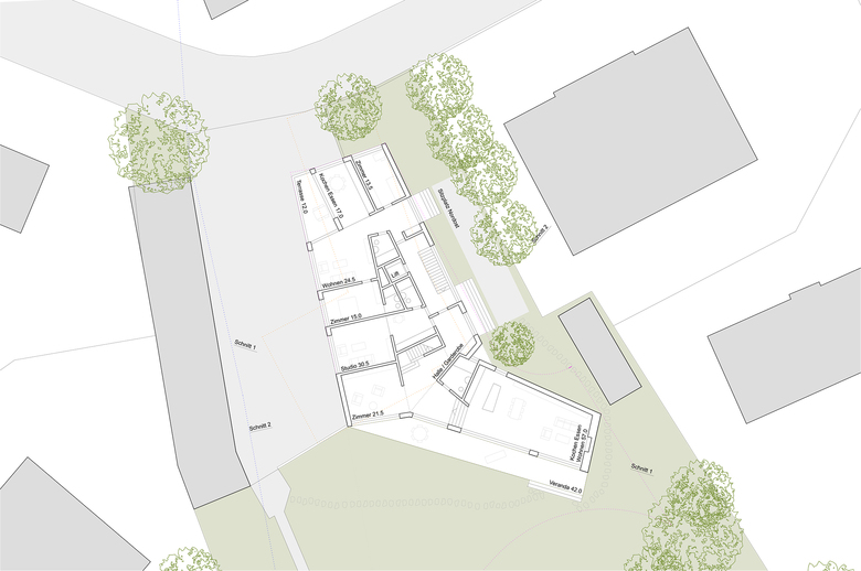Der „Strassenflügel steht rechtwinklig zur Weinhaldenstrasse. An der Nordwestseite ist der Zugang zum Haus, hier befinden sich auch die Briefkästen und direkt angrenzend der Veloraum. Im Erdgeschoss findet sich nordostseitig eine 3.5 Zimmerwohnung mit westseitigem Balkon, darüber die Attikawohnung mit einer zusätzlichen, grossen Terrasse Richtung Garten. Das Studio ist im Erdgeschoss untergebracht, direkt angrenzend an die Hauptwohnung.
