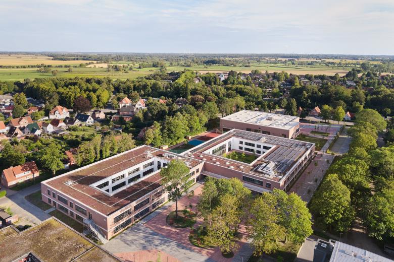 Aufgereiht wie an einer bewegten Perlenkette folgen die Neubauten für das Gymnasium und die Gemeinschaftsschule in Oldenburg der Typologie des aus den 1960er Jahre stammenden Hauptgebäudes: Ein zweigeschossiger roter Klinkerbau, der seinen introvertierten Charakter durch einen großzügigen Innenhof erhält und durch offene, klare Grundrisse überzeugt.