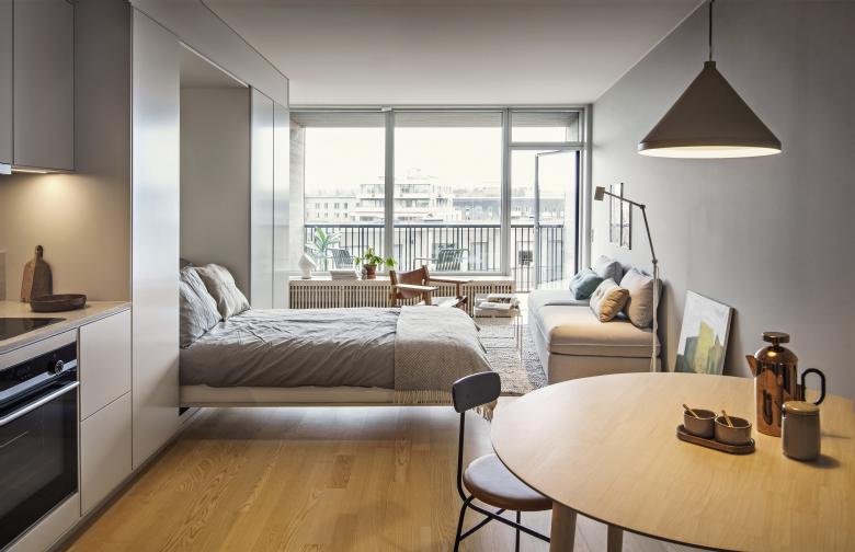 The project connects the old functionalist buildings of Hjorthagen in the northwest with the rapidly developing Norra Djurgårdsstaden. In the middle, the two curved building volumes create a public passage and an undulating courtyard, which is intended to be used both by the preschool and the residents together. The block provides new informal connections to the adjacent routes and green spaces – the Hjorthagspark and the characteristic large scale gasometers up on the hill.