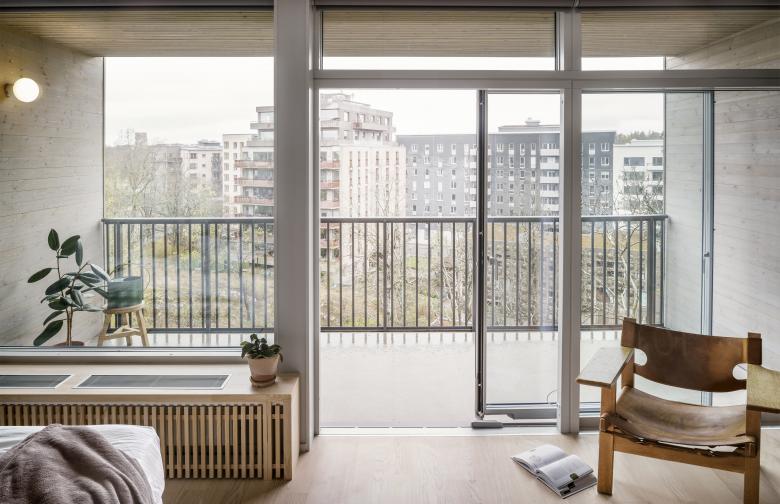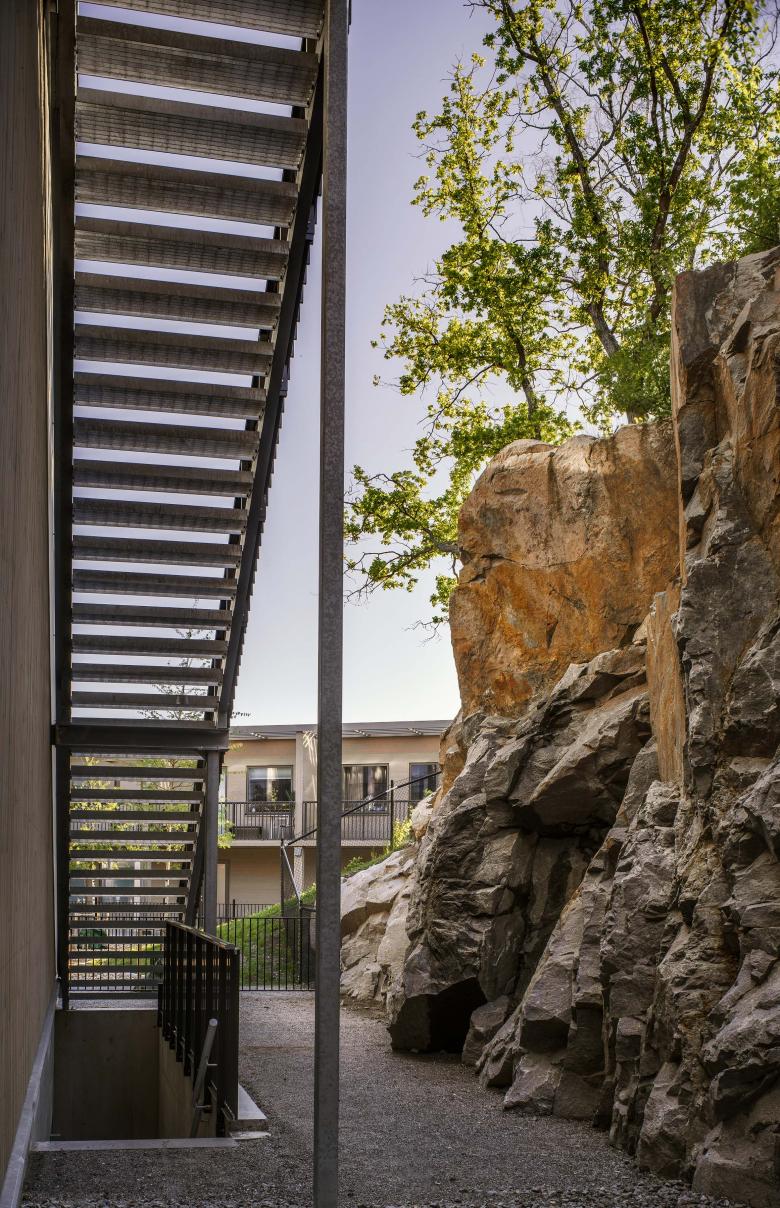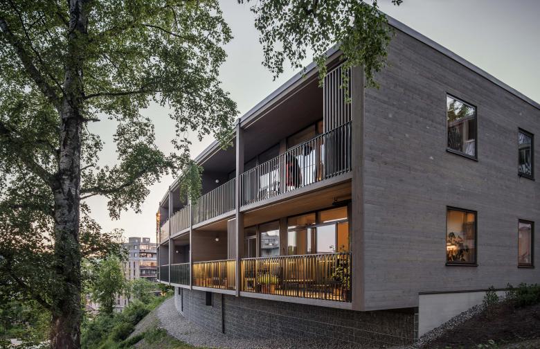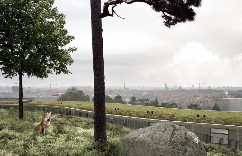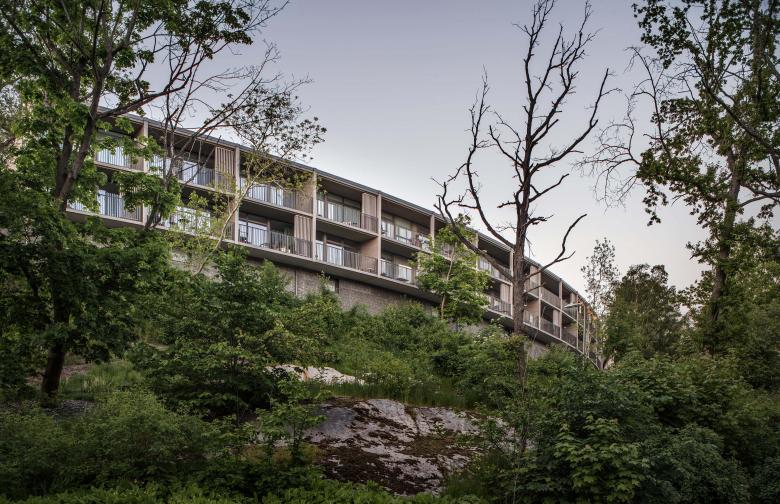 The site is a ledge in the landscape, a hill with large grown trees, formerly the Abessinien quarry, where the proposed buildings follow the steep topography along the mountain. The stepping cross section of the volumes creates a continuous movement where the spatial experience and views culminate into a crescendo in the form of a playground with a view towards the west over the cliff ridge. The housing units have vistas over a park with a humble character without acting intrusive.