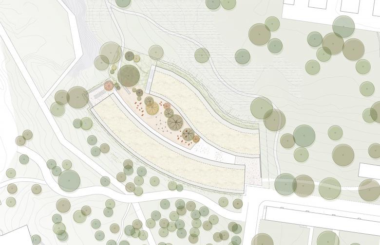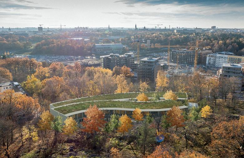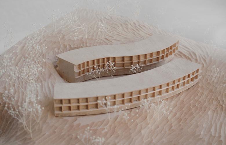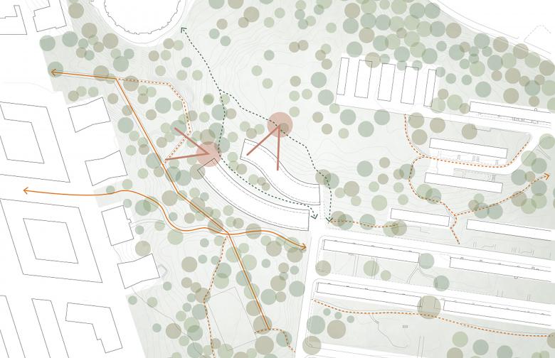The buildings are to be constructed in timber and stone with green roofs to become clearly anchored within the nature of their surroundings both in terms of form and materiality. The buildings are C- and S-formed in plan and are composed of wedge-shaped units.