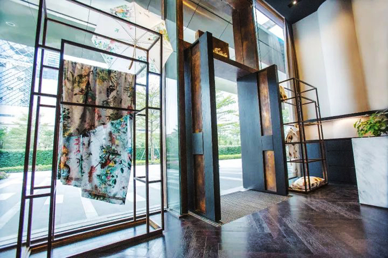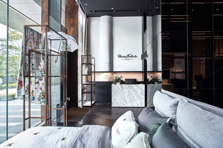 Our design story tells you a tale about the most beautiful materials, carefully craftet furniture and precious details. The impressive height of the new showroom will be enhanced by a built-in gallery floor. An immense monolith coated in parsol mirror glass will be dominating the architecture and hides simultanousely a lot of storage room. The desaturated colors are a perfect plattform for the beautiful Fischbacher Fabrics. Marble, oak, glass and brass are going to be combined to create an elegant and sophisticated atmosphere - translating the rich quality of the fabrics into the new interior design.