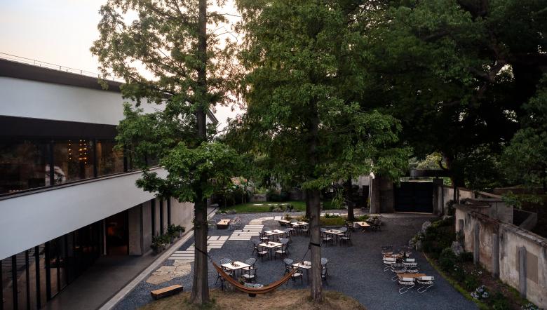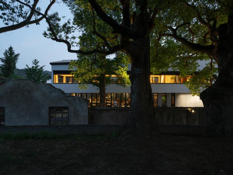 古树往往具有独特的场域感,当这个具有历史记忆属性的建筑和五棵古树并置时,创造了不同场域的交叠,因而产生了更多趣味性的空间,这种由并置而产生的交集传达了不同历史记忆的关系,也是一种建筑与环境间的关系。而选择以退让的处理方式(退在老墙内,退到树荫外),一方面是对历史和环境的尊重与保护,同时也意在弱化新建建筑的形式感,使其外部简单化而增强内部空间的多样性,以趋于景观化的姿态融在历史和环境中。