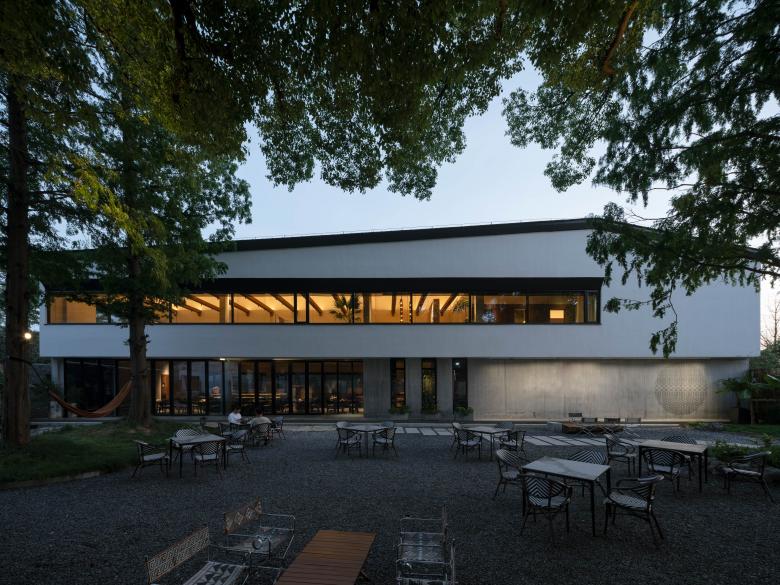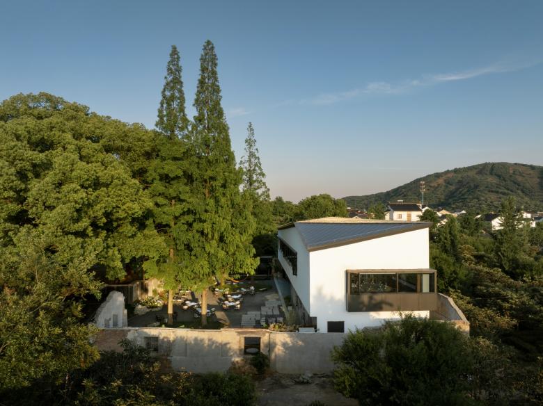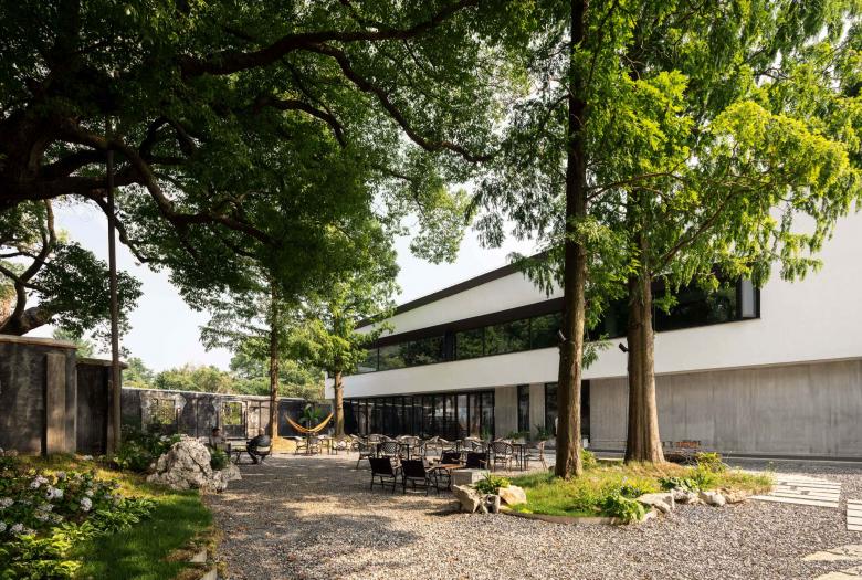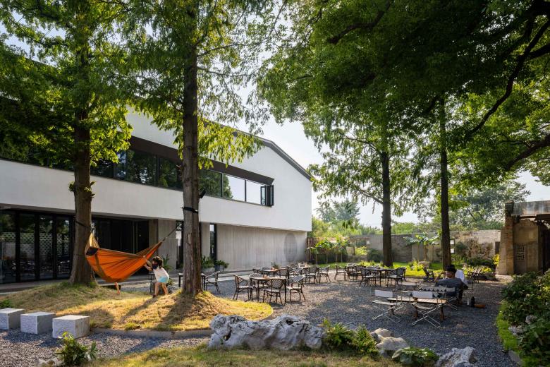 我们基于古树保护要求,保留院内的水杉及在硬化基础上设置休息区,供人们休息和活动。新建的建筑皆采用白色艺术外墙漆和深灰色铝镁锰屋面,以当代的方式回应江南水乡的粉墙黛瓦。