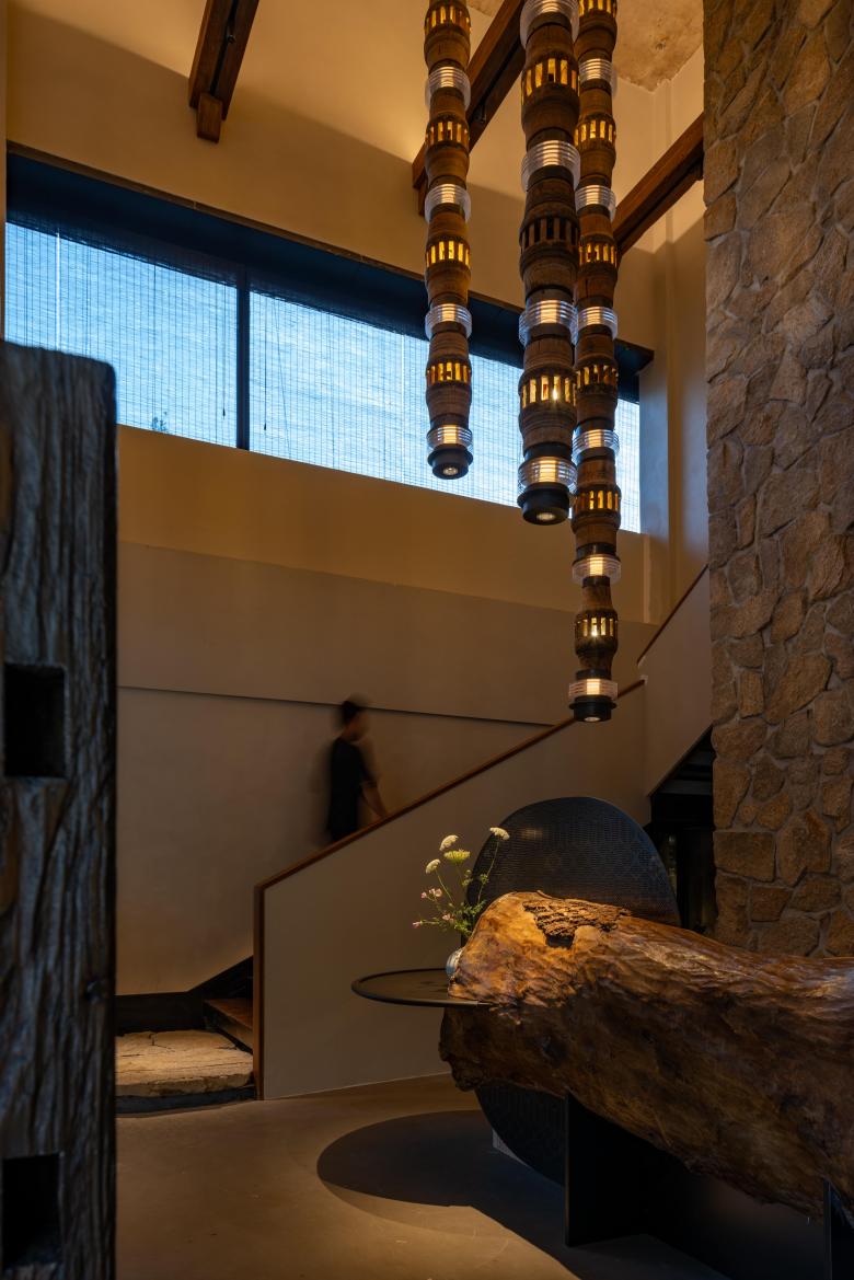 在室内空间上,一体浇筑的混凝土反梁让二层空间获得更大的挑空并且不再需要额外的装饰,一层空间则保留裸露的混凝土结构营造乡野空间的朴素感。基于这样“诚实的”建构裸露效果,空间内的空调则放置在飘窗下方进行侧出风的设计,同时照明则是叠加了一个老木梁的装饰构件弱化”灯具”的装饰性。