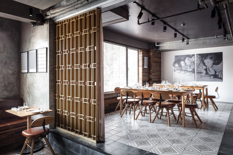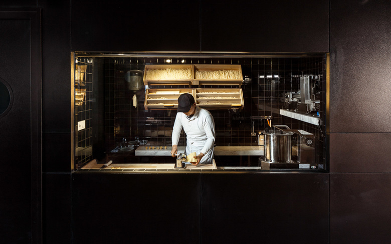 Located upstairs from a busy street, Osteria de Gemma is Italian restaurant crazy about pasta. A warm earthy color palette with natural finishes. The space includes a bar, formal dining and private function space. An open kitchen adds to the warm ambience, with the feature pasta room amongst the dinners creating movement and flair.