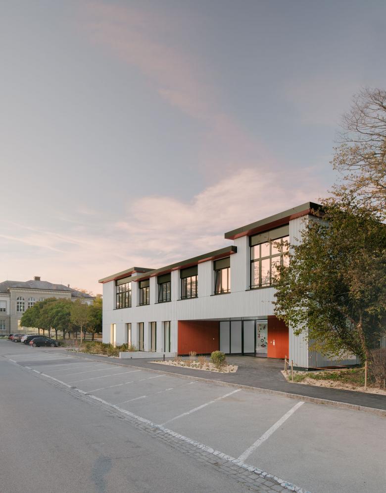 Um die Eigenständigkeit des Neubaus innerhalb des Areals zu stärken, wird das Wohn- und Therapiegebäude der Kinder- und Jugendpsychiatrie an der Westecke des Grundstücks platziert im Gegenzug dazu das Schulhaus an den Ostrand des Perimeters geschoben.