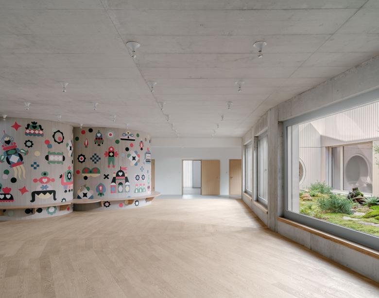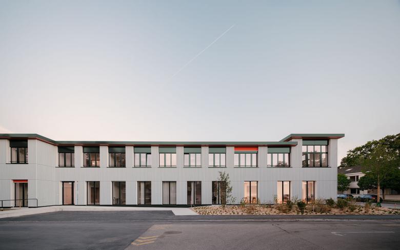Während sich letzteres als Teil der Zwischenzone, als Satellit im Grünraum und Teil der Parklandschaft versteht, ist das Wohn- und Therapiegebäude ein Haus mit vielen Gesichtern: An einer städtebauliche „Übergangssituation“ platziert, wo verschiede Strukturen und Landschaftsräume zusammen treffen, zeigt sich der Neubau zur Strasse hin als durchgehender, 2-geschossiger Bau und bildet dazu eine klare Front. Gegen Süden und Westen hin wird die Volumetrie stärker durch Abstufungen und Eischnitte aufgelöst und mit der Umgebung verwoben. Tektonische Vor- und Rücksprünge schaffen eine zusätzliche Anlehnung an die Massstäblichkeit der Bauten auf dem Areal und verweisen innerhalb des übergeordneten Aussenraums auf kleinräumliche Zonierungen und verorten das Bauvolumen.