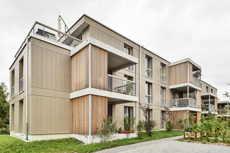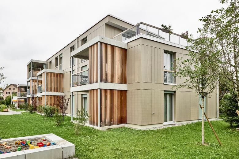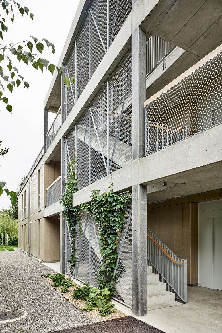 Der Laubengang und die gemeinsam genutzten Gartenflächen fördern ein gemeinschaftliches und lebendiges Wohnen. Sämtliche Wohnungen verfügen entweder über einen gedeckten Balkon, einen Sitzplatz zum Garten hin oder im Attikageschoss über eine Terrasse. Den Bewohnern stehen Hochbeete zur gemeinsamen Benutzung zur Verfügung. Der Garten wird dadurch zum Begegnungsort, die Platzsituation lädt zum Sitzen und Verweilen ein. Das Gebäude weist einen betonierten Kern im Bereich des Laubengangs und eine umlaufend gemauerte Aussenfassade auf. Die Fassade ist allseitig hinterlüftet und mit zementgebundenen Spanplatten verkleidet. Die Balkone aus Sichtbeton sind der Fassade vorgelagert und auf Stützen abgestellt.
