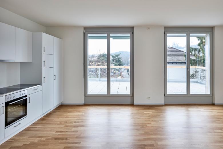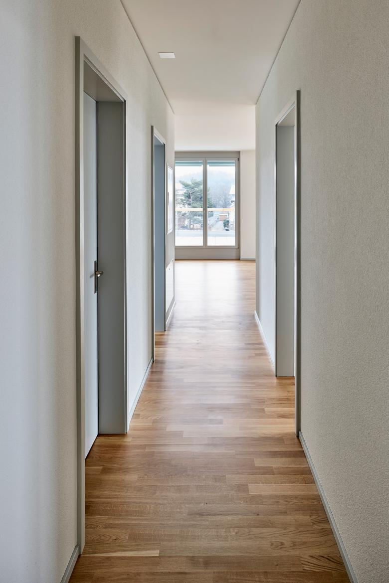 Eine klare statische Struktur mit einer einfachen Führung des Dämmperimeters, ein kompaktes Volumen mit effizienten Grundrissen und der Verzicht auf eine kostspielige Einstellhalle ermöglichen es, das Ziel von preisgünstigen Mietwohnungen zu erreichen. Trotz des Preisdrucks konnten Mehrwerte wie eine Raumhöhe von 2.70 m, eine Grundwasserwärmepumpe und eine PV-Anlage auf dem Dach umgesetzt werden.