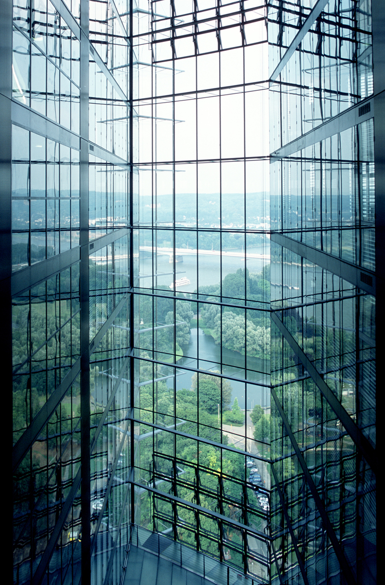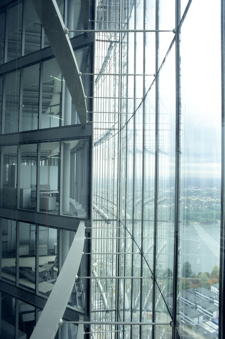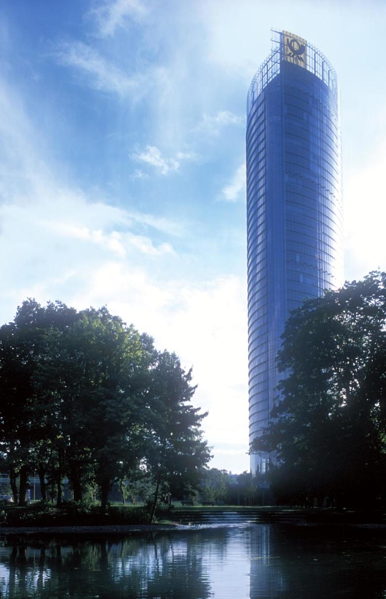 Das repräsentative Verwaltungsgebäude mit einem 40-geschossigem vollverglasten Büroturm und einem Sockelgebäude steht auf einem Grundstück nahe am Rheinufer. Hohe Anforderungen wurden an die Flexibilität und die Arbeitsplatzqualität gestellt. Das Konzept sah deshalb ausreichende natürliche Beleuchtung und Benutzerfreundlichkeit durch öffenbare Fenster und individuelle Heizungs-und Lüftungskontrolle vor. Dem Wunsch nach Minimierung der Betriebskosten für Heizen, Kühlen und Lüften wird durch Ausnutzung natürlicher Energiequellen erreicht.