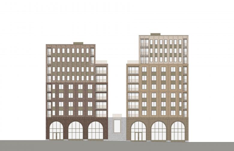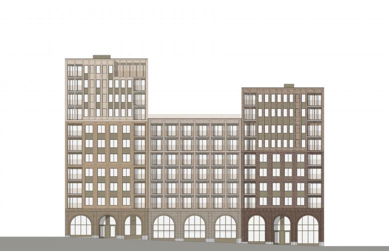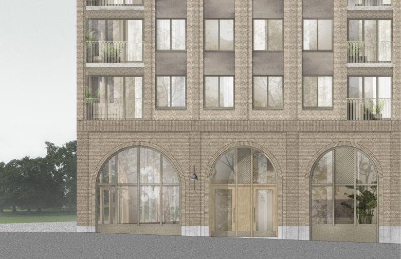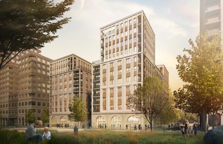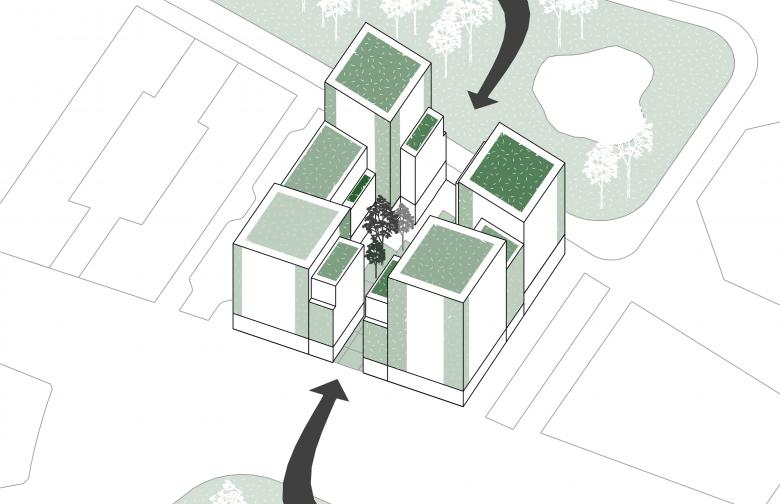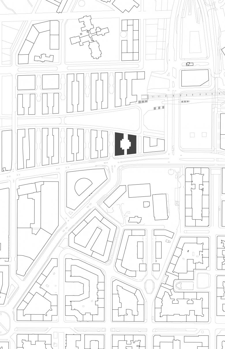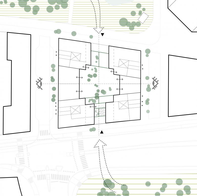 The footprint of the block is shaped like an asymmetric trapezium with towers in each corner and lower interconnecting buildings in between. The concept is based on a subdivision created by two perpendicular axes which delineate main pathways and a green inner courtyard at their intersection. Access to the courtyard, the two adjacent parks as well as neighbouring blocks is rendered easy. The strong connection to the green open space and locating retail on the ground floor provide proximity to recreation and nature in combination with active urban life.