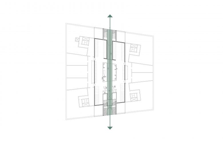 The layout is based on a classical urban typology dating back to Ancient Rome, defined by two intersecting axes. Applying such composition to Ribosomen has resulted in uninterrupted sightlines and strong movement flows, opening the block towards the surrounding urban fabric and generating new qualities.