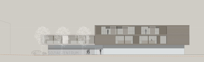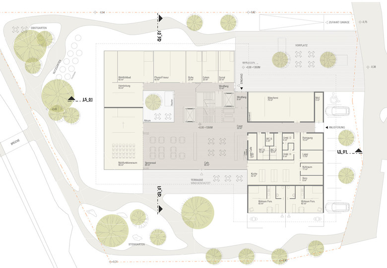 Der zweigeteilte, leicht versetzte Baukörper wird zentral auf dem Grundstück platziert. Durch die Abstufung zum Hang wird auf die Nähe des bestehenden Altenheimes reagiert, durch die Höhendifferenzierung entsteht eine vormittags besonnte Dachterrasse im OG2. Besonderer Wert wird auf die Schaffung von wind- und wettergeschützten Zonen gelegt. So ermöglicht der Baukörperversatz einen abgeschirmten Eingangsbereich sowie eine Südterrasse im Erdgeschoß, die durch den baulichen Schutz zum Verweilen einlädt. Großzügige Lichthöfe sorgen für freundliche Erschließungs-, Aufenthalts- und Bewegungsbereiche im Inneren. Dabei finden Serviceeinrichtungen, Wirtschaftsräume und Verwaltung im Erdgeschoß ihren Platz. Die beiden Wohngruppen des Pflegeheimes sind im OG1, das Betreute Wohnen ist im OG2 untergebracht.