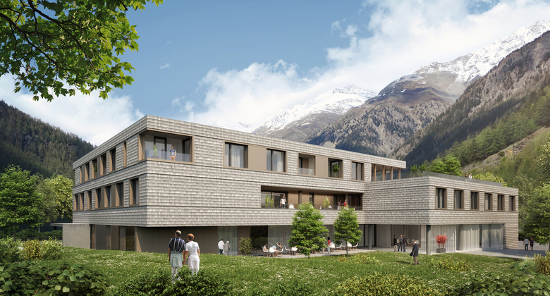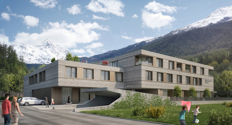 In unmittelbarer Nähe zum bestehenden Altenheim soll in Sölden ein Sozialzentrum mit Pflegeheim und Betreutem Wohnen entstehen. Der Entwurf von DIN A4 Architektur für den ausgeschriebenen Wettbewerb sieht einen zweigeteilten Baukörper vor, der alle räumlichen und funktionellen Anforderungen einer zeitgemäßen Pflege- und Betreuungseinrichtung erfüllt. Die Jury des Wettbewerbs vergab dafür den 1. Preis und beauftragte DIN A4 Architektur Ende September mit der Planung und Umsetzung des Objektes.