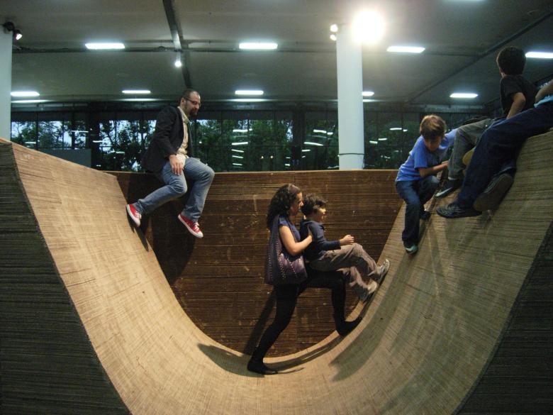 Upon the invitation of the curators Moacir dos Anjos and Agnaldo Farias, Vazio S/A participated in the terreiro “The Other, the Same”, an arena for dance, theatre, and music events that could be rearranged in several ways. Composed of movable trolley modules made out of stacked cardboard, the arena could be prepared as a theatre for shows, isolated from the rest of the exhibition, but could also be expanded (magnifying its space), amalgamated (turning into a maze), shrunk (thus creating lanes, corners, and residual spaces), scattered (diluting its presence to the point of near-invisibility), or simply put to use as benches and chaise lounges for visitor relaxation.