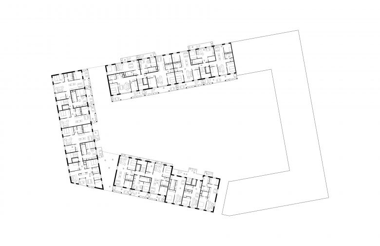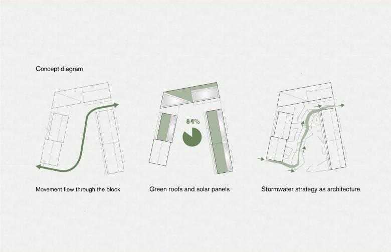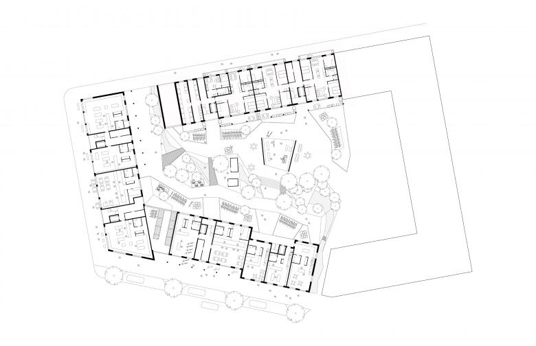 The project comprises 100 rental units of various sizes, ranging from townhouses to five and six-storey buildings. The proposal recognizes a demand for unconventional forms of accommodation, where one has access to additional activities, contexts and functions beyond the own dwelling; such as a workshop in the courtyard, a greenhouse on the roof, a space where you can repair your bike in a green and generous setting.