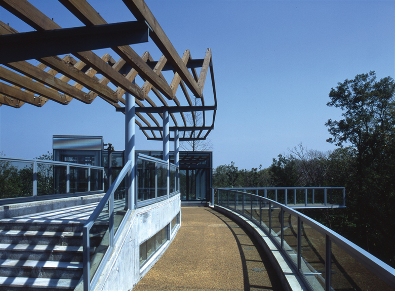 Considering the unique characters of the exhibits, the design breaks away from the “black box” stereotype of museum design, making live species and outdoor natural environment the main exhibits. Rising two stories high, a semi-underwater window nearly 13 meters long shows a complete section of the wetland from its bottom and water body to its shore. The sunken courtyard outside of the west wall on the second floor displays through a window live plants typical in the wetland. Five cameras are installed across the reserve. Visitors can see real-time images anywhere in the reserve by pointing a laser pointer to the corresponding area of a model on the first floor. Finally, the observation deck on the roof affords visitors a direct, panoramic view of the wetland. A cantilevered observation deck extends 7.5 meters into the wetland to allow visitors a closer look of the tree tops and birds.