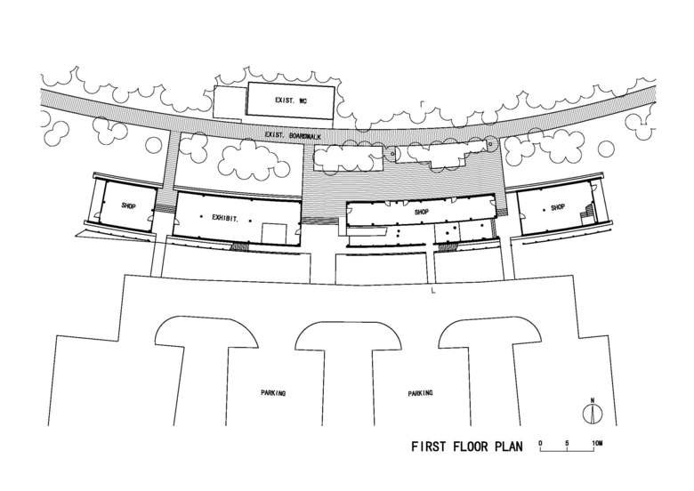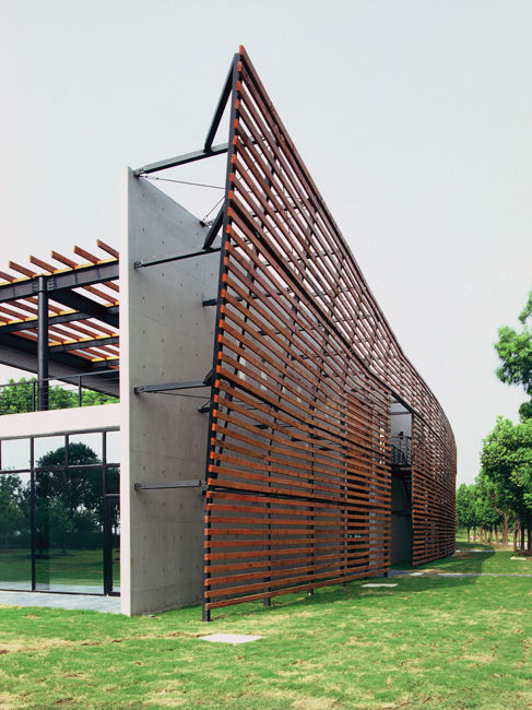 By its nature, a visitor center is the front door of a place. But a door presumes the existence of a wall. Considering the linear shape of the site, I feel that it is appropriate to make the building a “wall.” Indeed, people getting out of their cars will see a curved “wall,” 99 meters long and 7.75 meters high, along the entire north side of the parking lot, Three doorways of varied sizes are punched out from the “wall,” opening up passages into the Park. Being accentuated by the surrounding “wall,” the sceneries revealed in the openings appear particularly enticing,