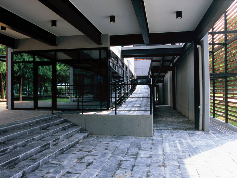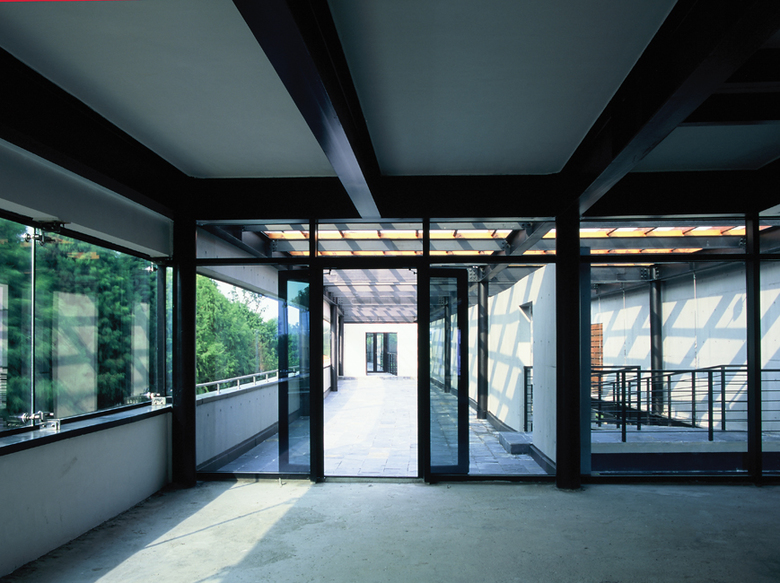 The big surprise comes when people enter the doorways. Looking east and west, they will find that the “wall” in fact contains complex spaces between its two concrete exterior shells. Because few solid crossing partitions exist in the building, one can see various spaces, bright and dim, indoor and outdoor, high and low, orthogonal and diagonal, juxtaposed along the longitudinal direction of the cavity. For example, the sunken court under the ramp recalls a shadowy valley studded with trees.