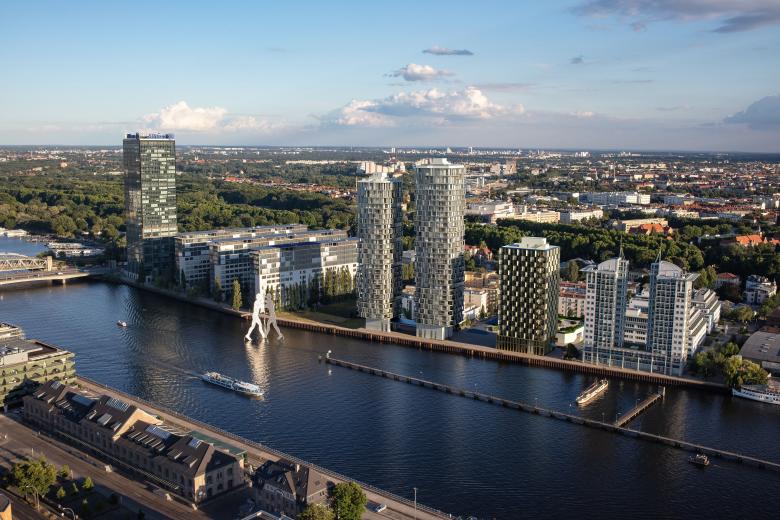 Apartmenthotel, 180 Liftzimmer von 30 bis 60 qm mit Kochnische und Balkon. Erdgeschoss mit Hotellobby und Administration, Restaurant und Bar mit Außensitzflächen an der Spree. Spa-, Sauna- und Fitnessbereiche ebenfalls mit Außenflächen