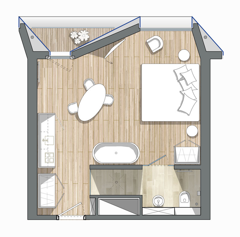 Im Erdgeschoss betritt der Besucher eine Hotellobby mit Empfang und Administration sowie eine Bar nebst Restaurant mit Küche für eine gehobene Gastronomie und Außensitzflächen an der Spree. Auf zwei weiteren Ebenen gibt es Spa-, Sauna- und Fitnessbereiche ebenfalls mit Außenflächen.