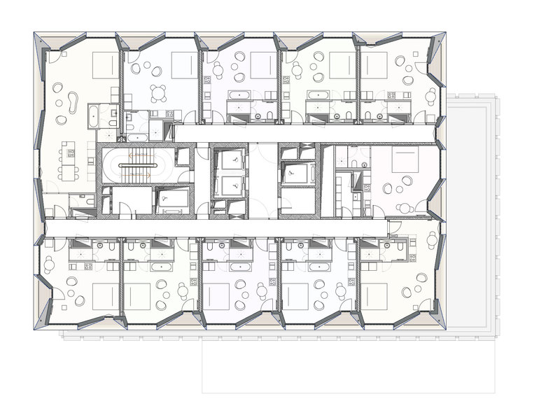 Den Anforderungen an spannungsreiche Innenräume, einen kleinen Balkon je Einheit und dem Leitgedanken eines, im Detail prägnanten, im Gesamten jedoch homogenen Baukörpers entsprechend, ermöglicht eine gefaltete Fassadenstruktur zahlreiche Außenraumbezüge in den Lofts und ein kristallines, vielschichtiges Erscheinungsbild zum Außenraum.