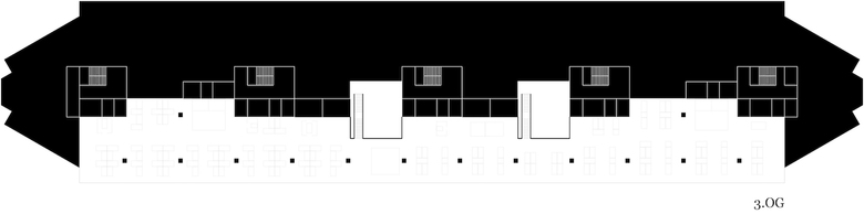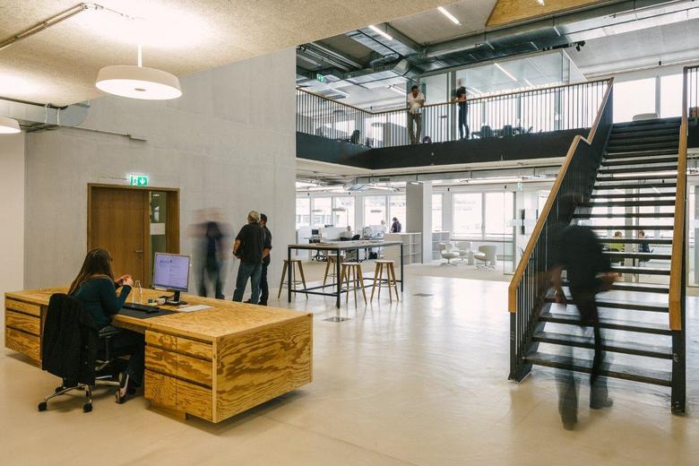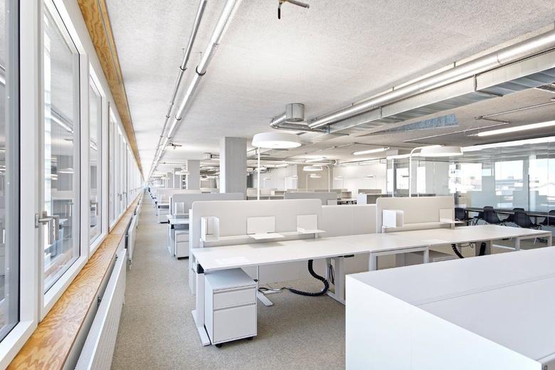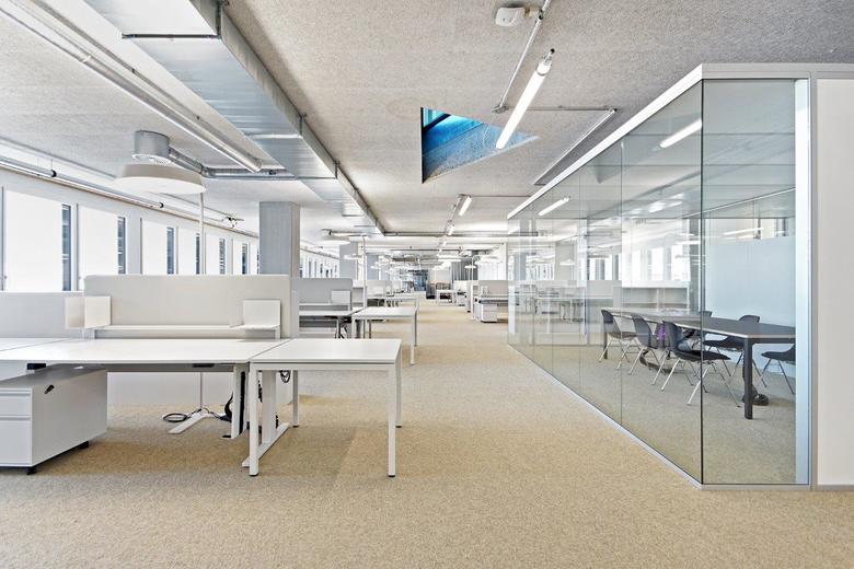 Auf zweimal 114m Länge entstand eine Bürolandschaft mit grosszügigen, doppelgeschossigen Agoren, Sitznischen und gläserne Besprechungsboxen. Die Arbeitsplätze reihen sich entlang der durch die massiven Betonstützen rhythmisierte Fassadenflucht auf und profitieren von viel Tageslicht und Sicht auf den Freilager-Platz.