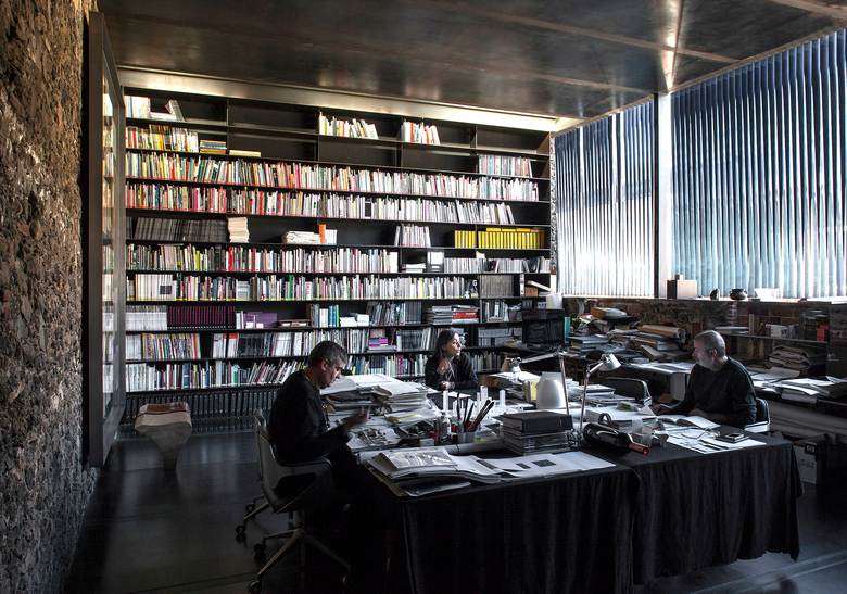 The old Barberí foundry, built at the beginning of the 20th century was acquired by the architects in 2004 for their office, which they like to call Barberí Laboratory. The previous building had smoke-laden walls, ceilings and floors from previous fires. The materials, colors and smells of the old furnace and chimneys provided the powerful starting point for the new project. There are three main parts to the office, the double-height library which runs along the length of the building, a second building opening onto the courtyard with workstations, and a new glass enclosed pavilion supported by iron columns. The original materials – wood, stone, and ceramics – are in contrast and dialogue with the new steel and glass, which were added to make highly functional and inspirational spaces. The trees and ferns in the interior courtyard spaces make both a divergence and a connection between architecture and nature.