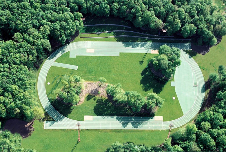 The area called Tossols-Basil, which is designated for leisure activities, is located at the edge of both a city and a natural park along a river. When contemplating adding sports facilities here, the architects faced a dilemma of either clearing large amounts of slow-growing oak trees or succumbing to environmentalists who wanted no change at all. The solution was to site the athletic track in a forest clearing, previously used for cultivation. Nature and sport are united and runners appear and disappear as they make their way around the track. The project highlights the beauty of the landscape and preserves the vegetation as a filter that changes with the seasons. The seating for observing the athletes is developed as small terraces or embankments between the clearings, often using the natural topography. The slender lighting towers become points of reference in the landscape.