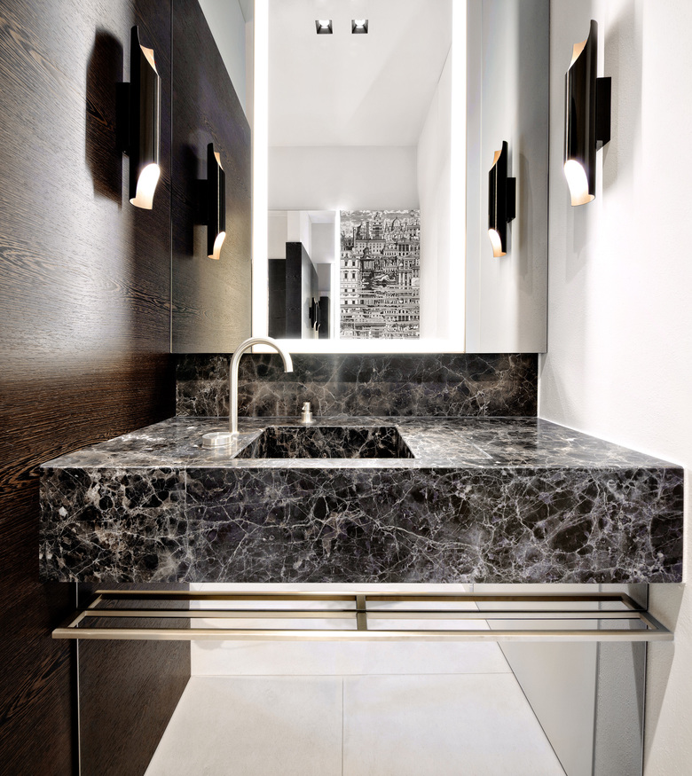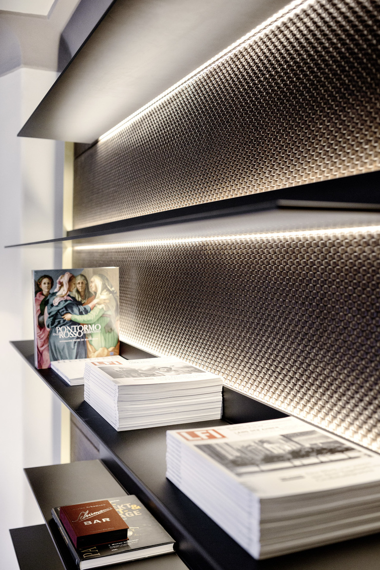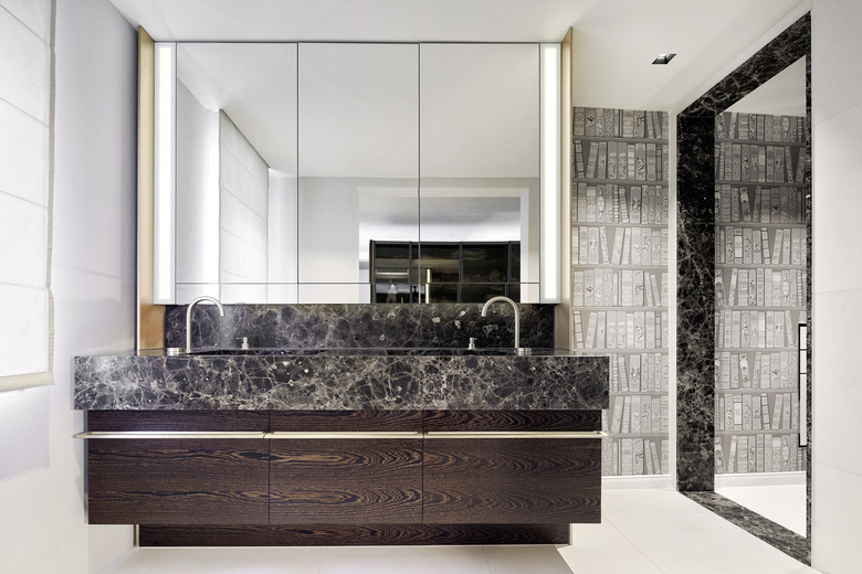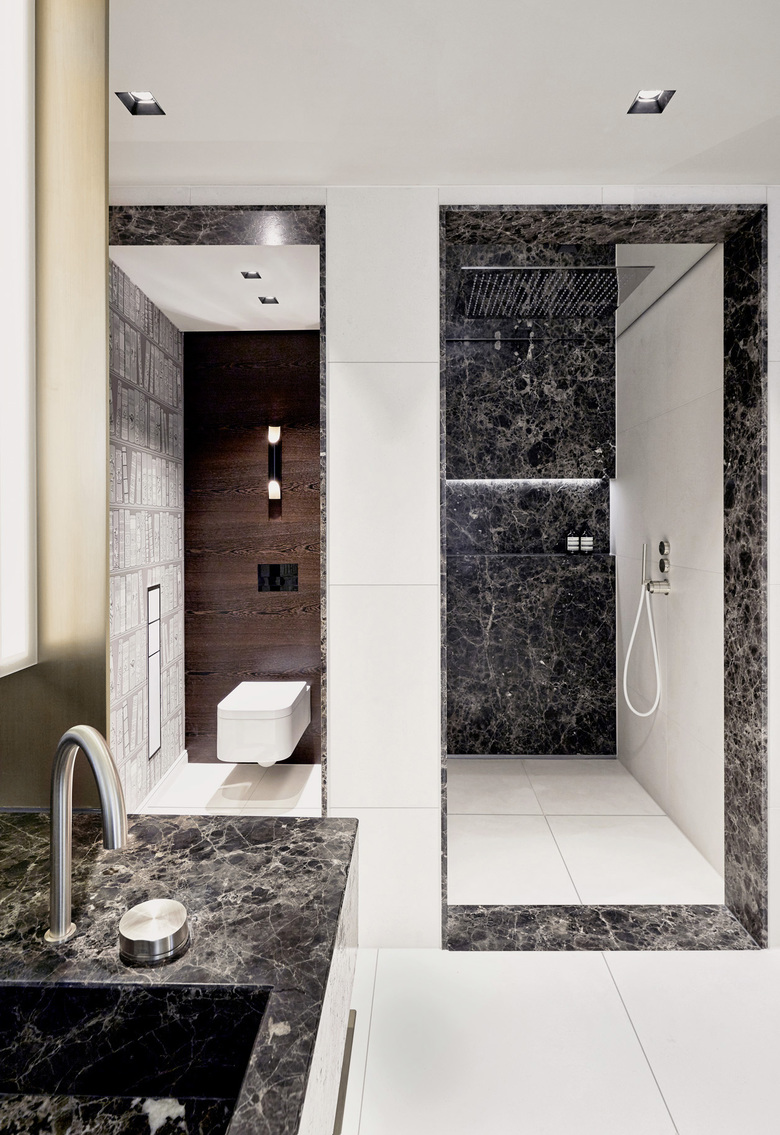 Im Lichtkonzept drückt sich die Affinität des Bauherrn zu technischer Raffinesse aus – die gesamte Technik im Haus kann von einer Applikation am Handy aus gesteuert werden. In der Küche und in den Bädern wird das Wechselspiel aus Tradition und Moderne besonders sichtbar: massives gebürstetes Messing trifft auf opulenten Emperador Marmor und dunkles massives Wenge Holz. Besonderer Wert wurde auch auf die Verwendung von nachhaltigen Materialien gelegt und eine überdauernde handwerkliche Verarbeitung.