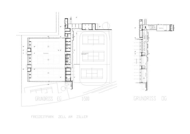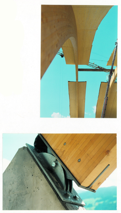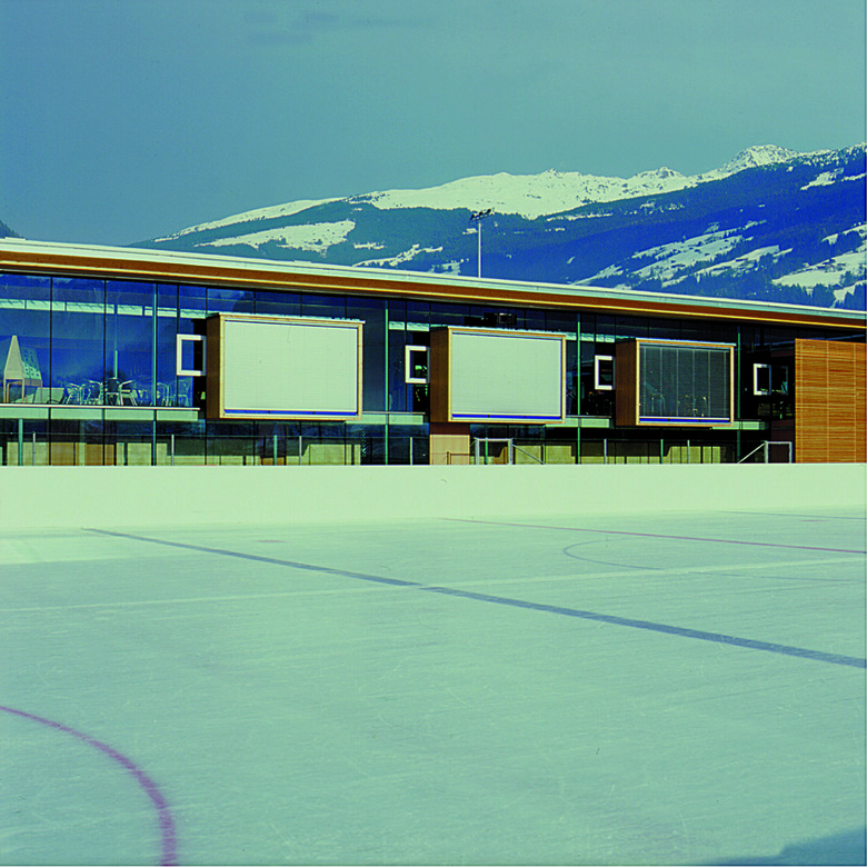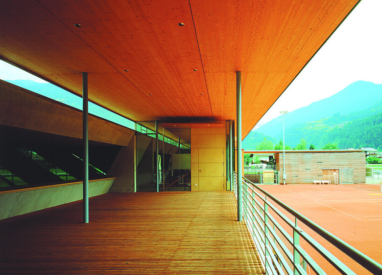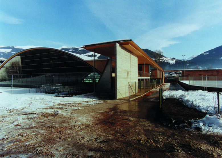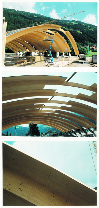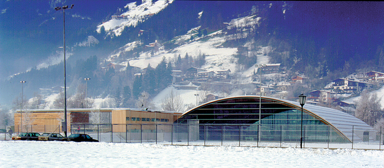 Die Halle mit verglasten, leicht schräggestellten Stirnwänden, besteht aus einer extrem schlanken Holzkonstruktion mit Spannweiten bis zu 42 Metern (2 Gelenksbogen Holzleimbinder und mittragende Schale aus 5 cm Dreischichtplatten). Das Gerüst erinnert an die langgestreckten Holzlagerstätten der Zillertaler Holzproduzenten und etwas an die klassische Freizeitarchitektur der Strandbäder.