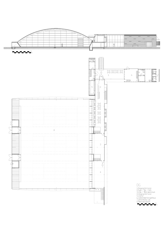 Das Bauwerk selbst setzt sich aus zwei klar lesbaren Elementen zusammen: Die Halle und das Gerüst.