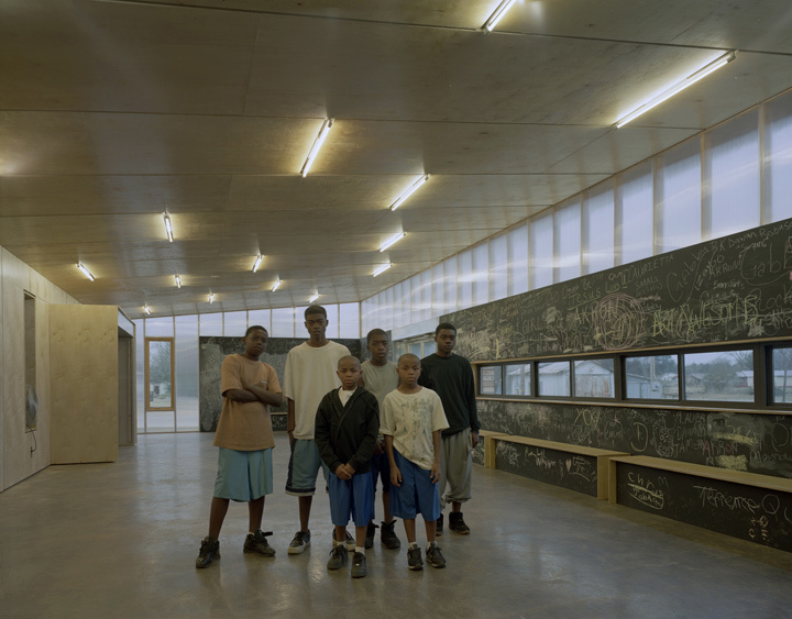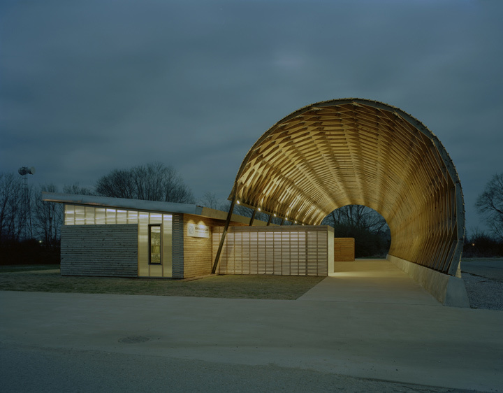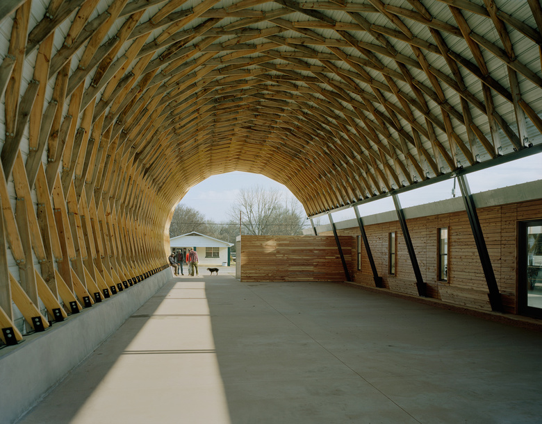 A large span lamella structure covers a basketball court connects to a 1500 SF recreation space.