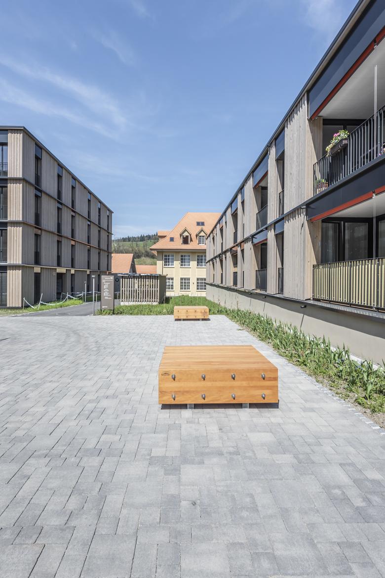 Das Planungsgebiet befindet sich am Ortsrand von Bärau in einer Senke zwischen der Bäraustrasse und den Bahngleisen. Das angrenzende Gebäudeensemble der ehemaligen Lauterburg-Fabrik prägt den Ort und hat einen hohen Identifikationswert. Insbesondere die alte Zettlerei ist aus dem Strassenraum stark spürbar. Die neue Überbauung an der Bäraustrasse wird präzise in diese sensible Nachbarschaft eingepasst. Zwei Wohnzeilen bilden den Auftakt und somit auch eine adäquate Adresse für das neue Quartier. Das städtebauliche Muster, bestehend aus drei unterschiedlichen Baukörpern, ist in der Höhe von 3 bis 5 Geschossen gestuft. Die versetzte Anordnung der Gebäude ermöglicht spannende Durchblicke und Durchwegungen und eröffnet den Bewohnern Ausblicke in die umliegende Landschaft. Die Baukörper werden durch drei Höfe zu Baugruppen zusammengebunden. Diese lehnen sich an die regional typischen Baugruppen der landwirtschaftlichen Gehöfte an und schaffen für deren Bewohner Identität und Massstäblichkeit. Die gesamte Siedlung wird durch das sorgfältige Einbetten in die Landschaft hindernisfrei gestaltet.
