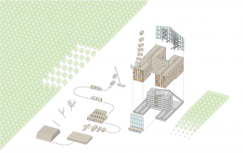 Alle Büros wurden als vorgefertigte Massivholzmodule konzipiert. Werkseitig werden Fensterelemente, ein Holzrahmen mit Wärmedämmung und integrierter Sonnenschutzanlage und eine Unterkonstruktion für die Fassadenbekleidung aus farbigem Glas in das Modul eingebaut. Lediglich die Bodenplatte, die Technikräume im Erdgeschoss und das zentrale Atrium werden in Stahlbetonfertigteilbauweise errichtet. Das Materialkonzept der Innenräume folgt der konstruktiven Logik dieser Hybridkonstruktion, die Rohbaumaterialien Holz und Beton bleiben hier sichtbar.