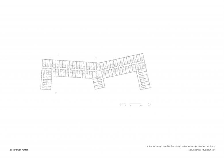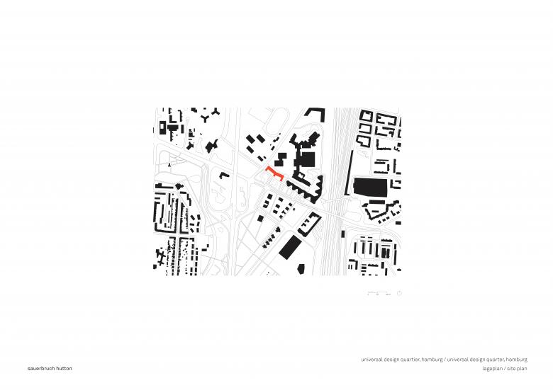Mit seiner kammartigen Struktur bindet sich der Neubau in den kleinteiligeren Maßstab seiner Umgebung ein und schreibt damit die städtebauliche Figur der benachbarten Behörde für Stadtentwicklung und Wohnen entlang einer vielgenutzten Fußweg- und Fahrradverbindung fort.